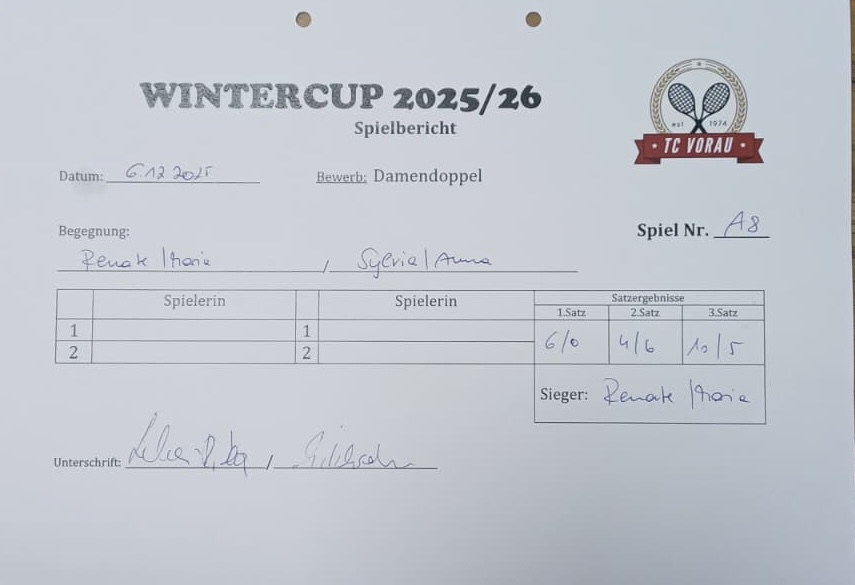 | 22.11.2025, 17:00 | Andrea (S) & Anita | : | Helga & Maria M. | 7:5 2:6 9:11 | Herunterladen |