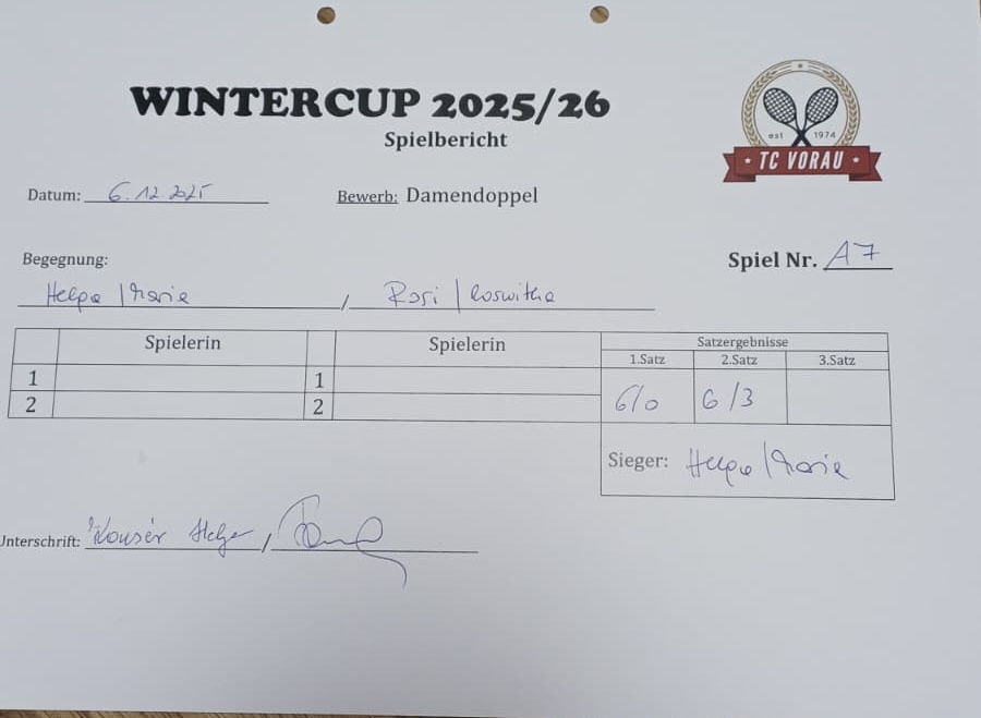 | 06.12.2025, 17:00 | Helga & Maria M. | : | Rosi & Roswitha | 6:0 6:3 | Herunterladen |