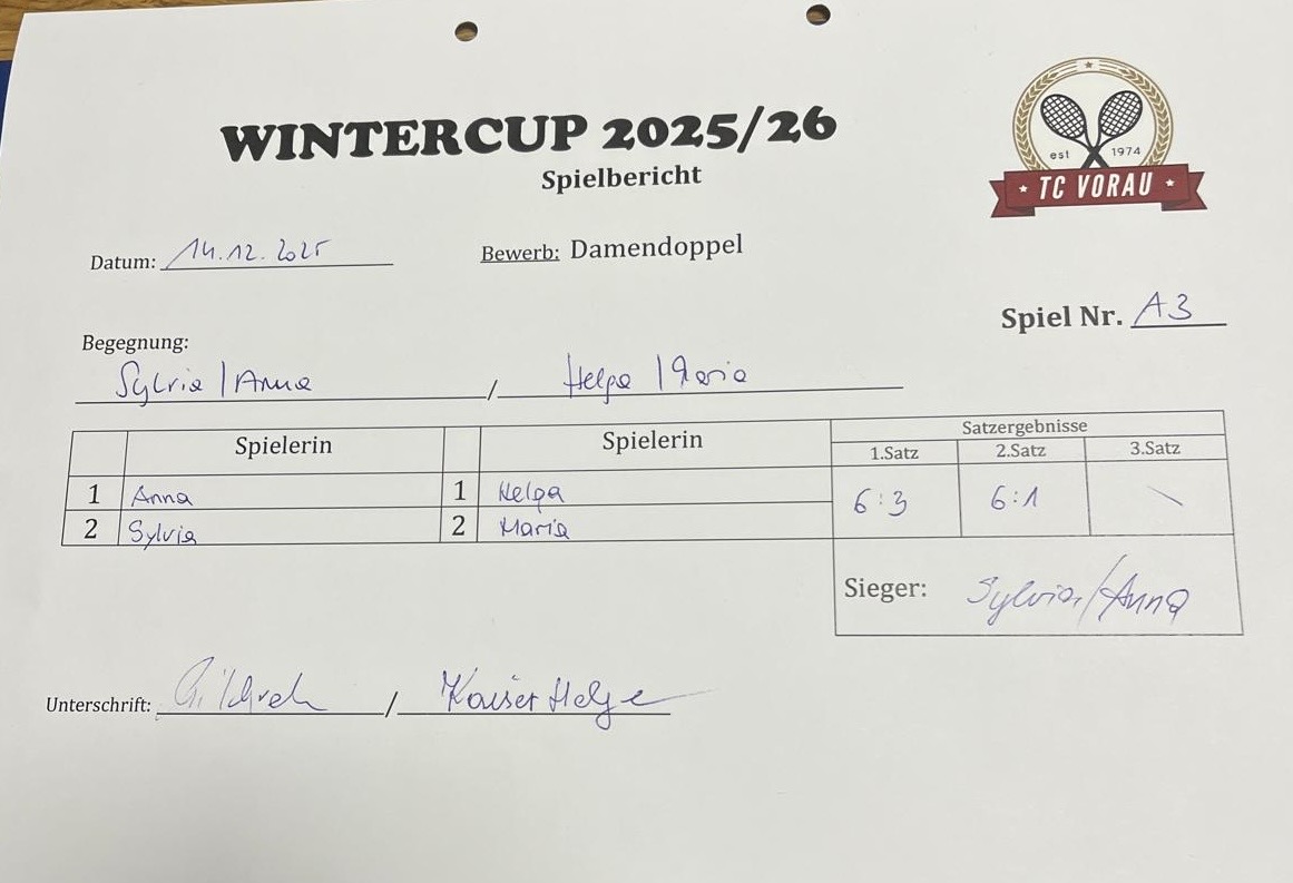 | 22.11.2025, 18:30 | Sylvia & Anna | : | Andrea(V) & Gabi | 6:4 6:2 | Herunterladen |