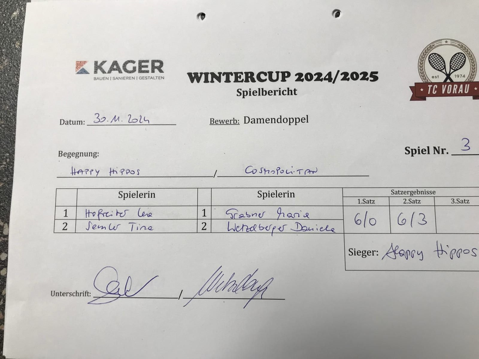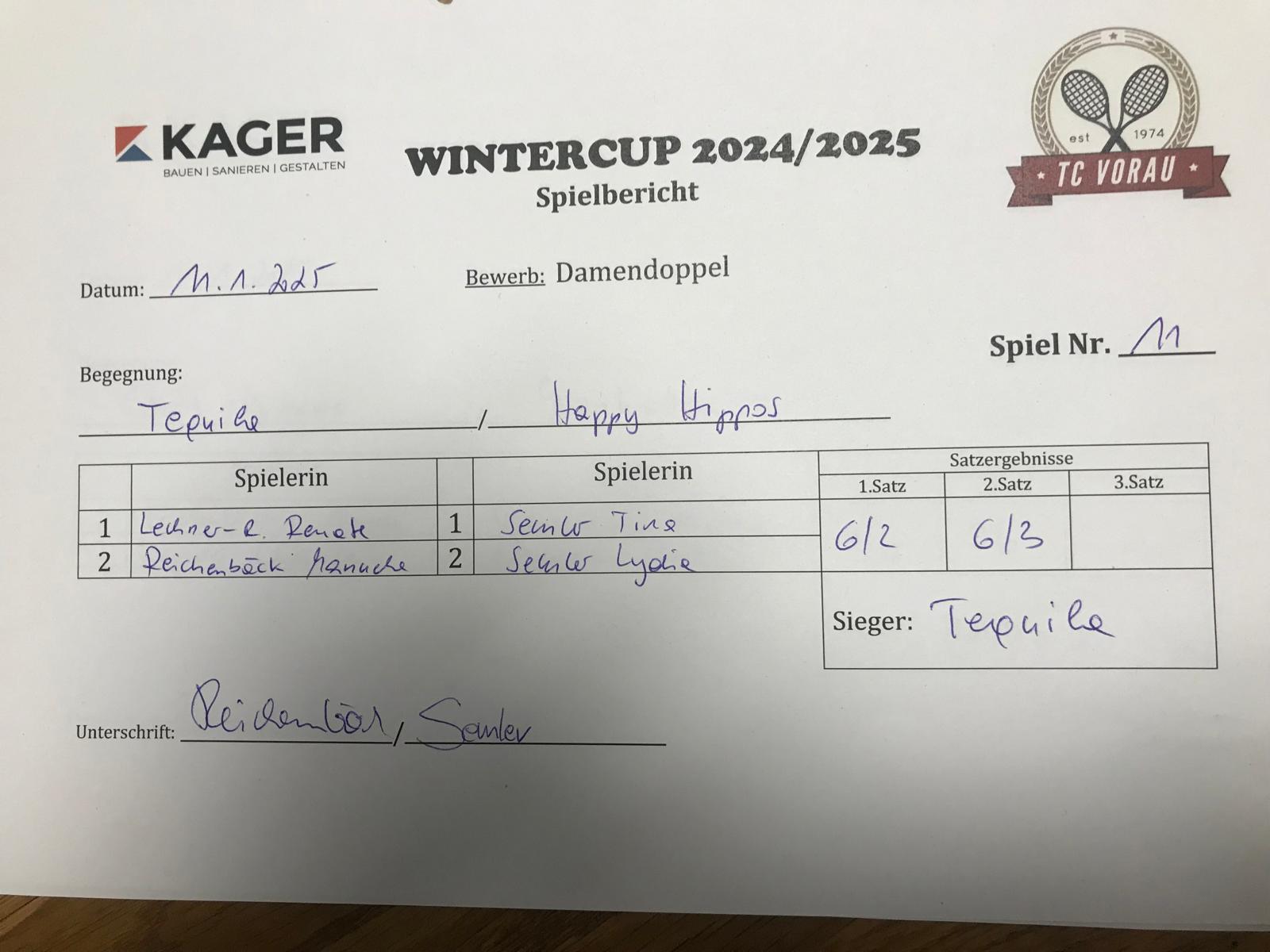 | 11.01.2025, 17:00 | TEQUILA | : | Happy Hippos | 6:2 6:3 | Herunterladen |
