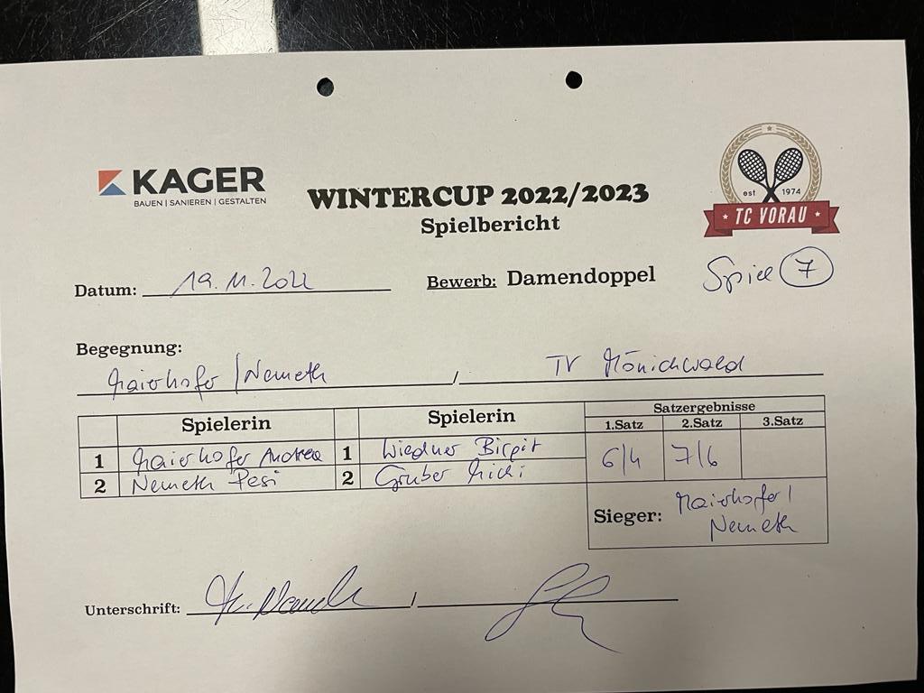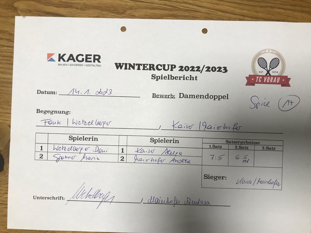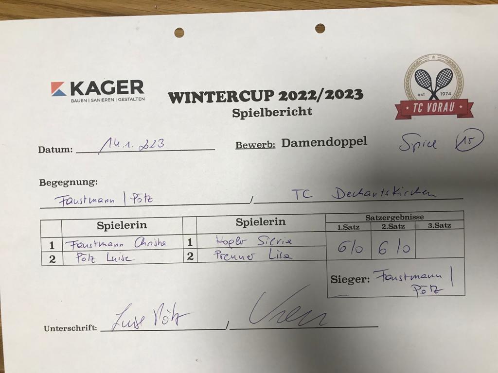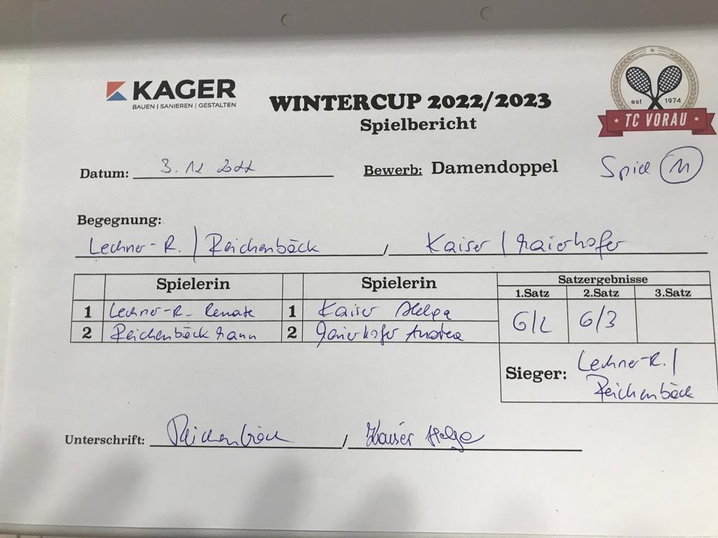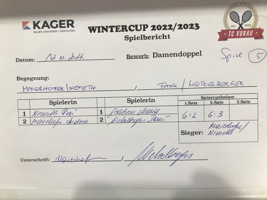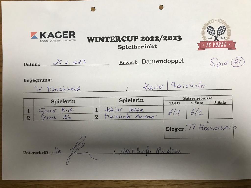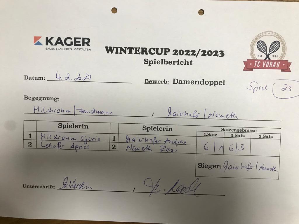 | 28.01.2023, 17:30 | Kaiser/Maierhofer | : | Faustmann/Pötz | 1:0 | - |
