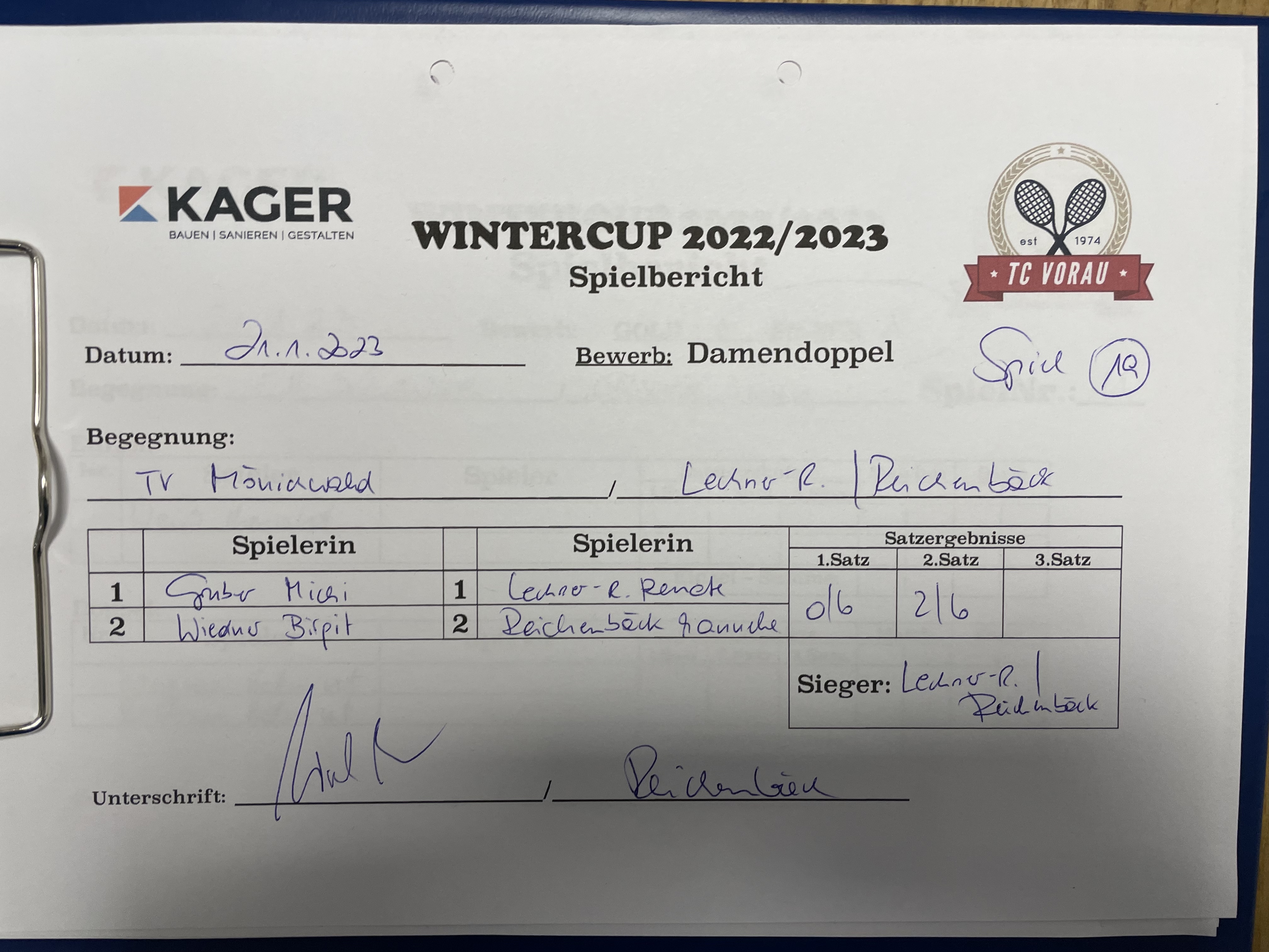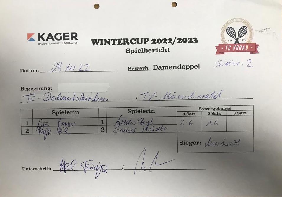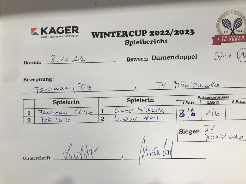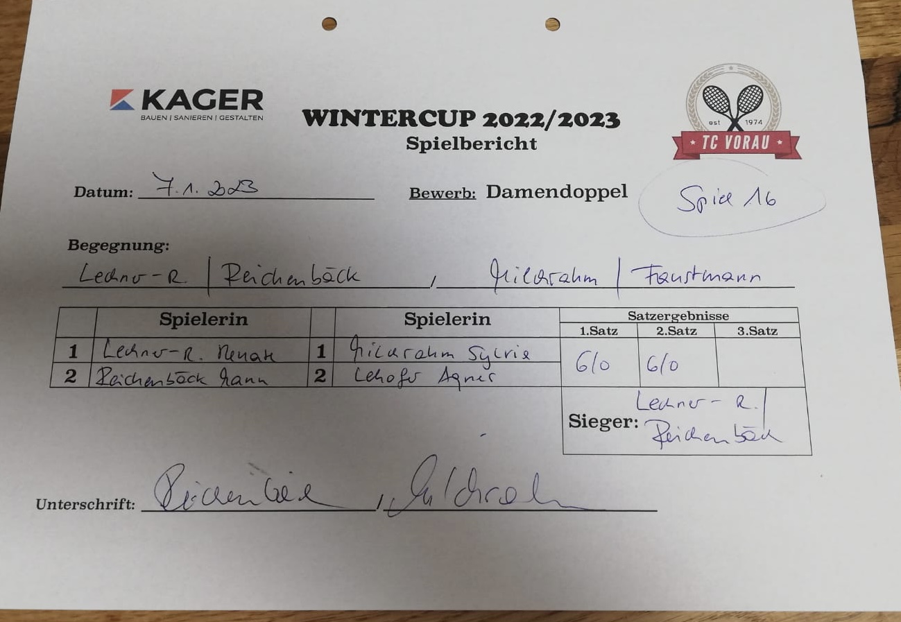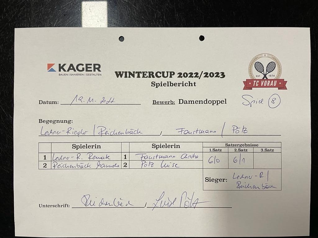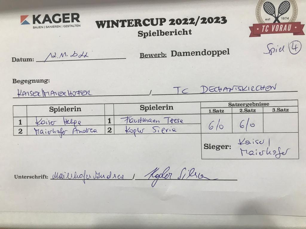 | 28.01.2023, 17:30 | Kaiser/Maierhofer | : | Faustmann/Pötz | 1:0 | - |