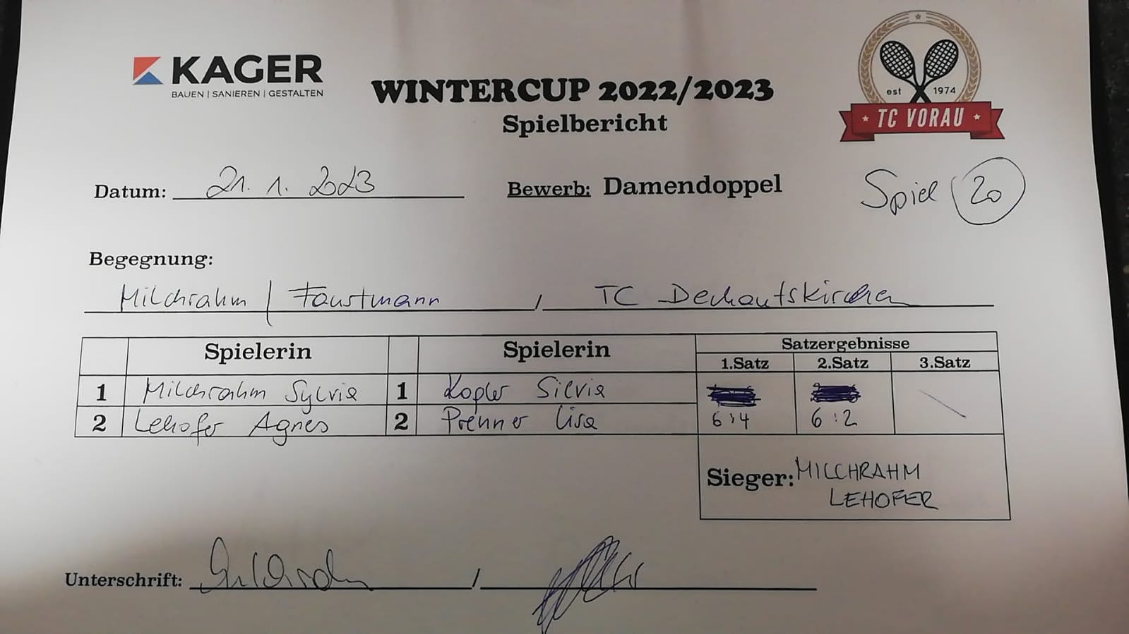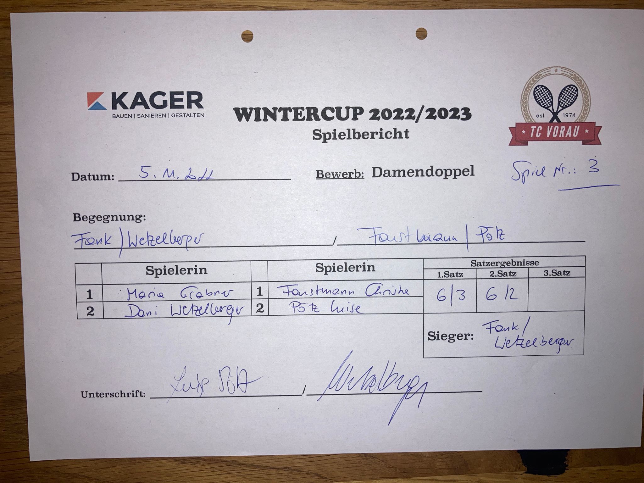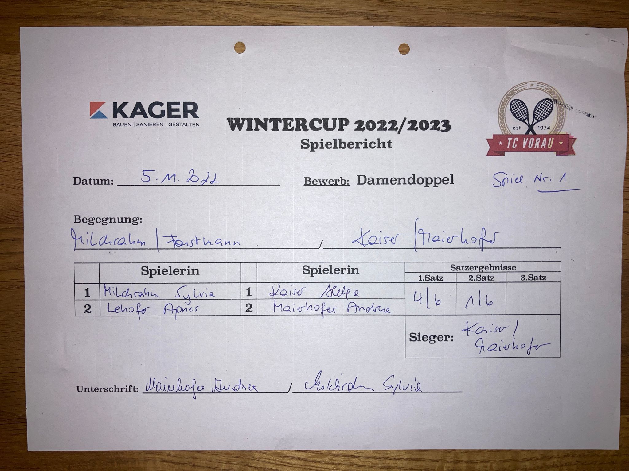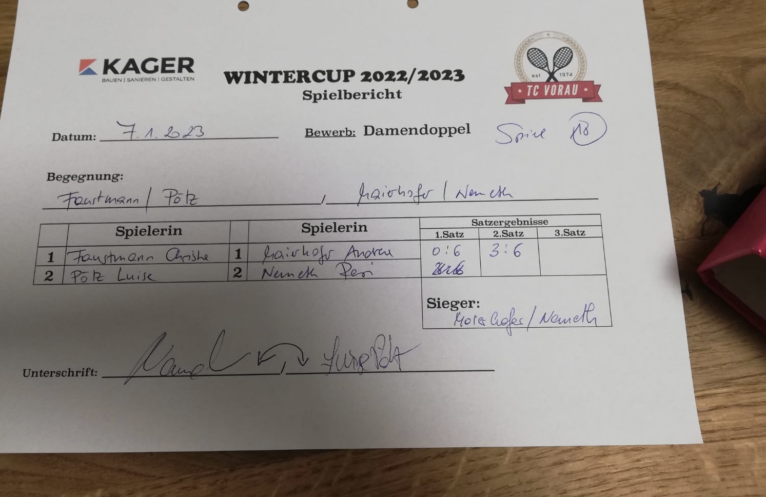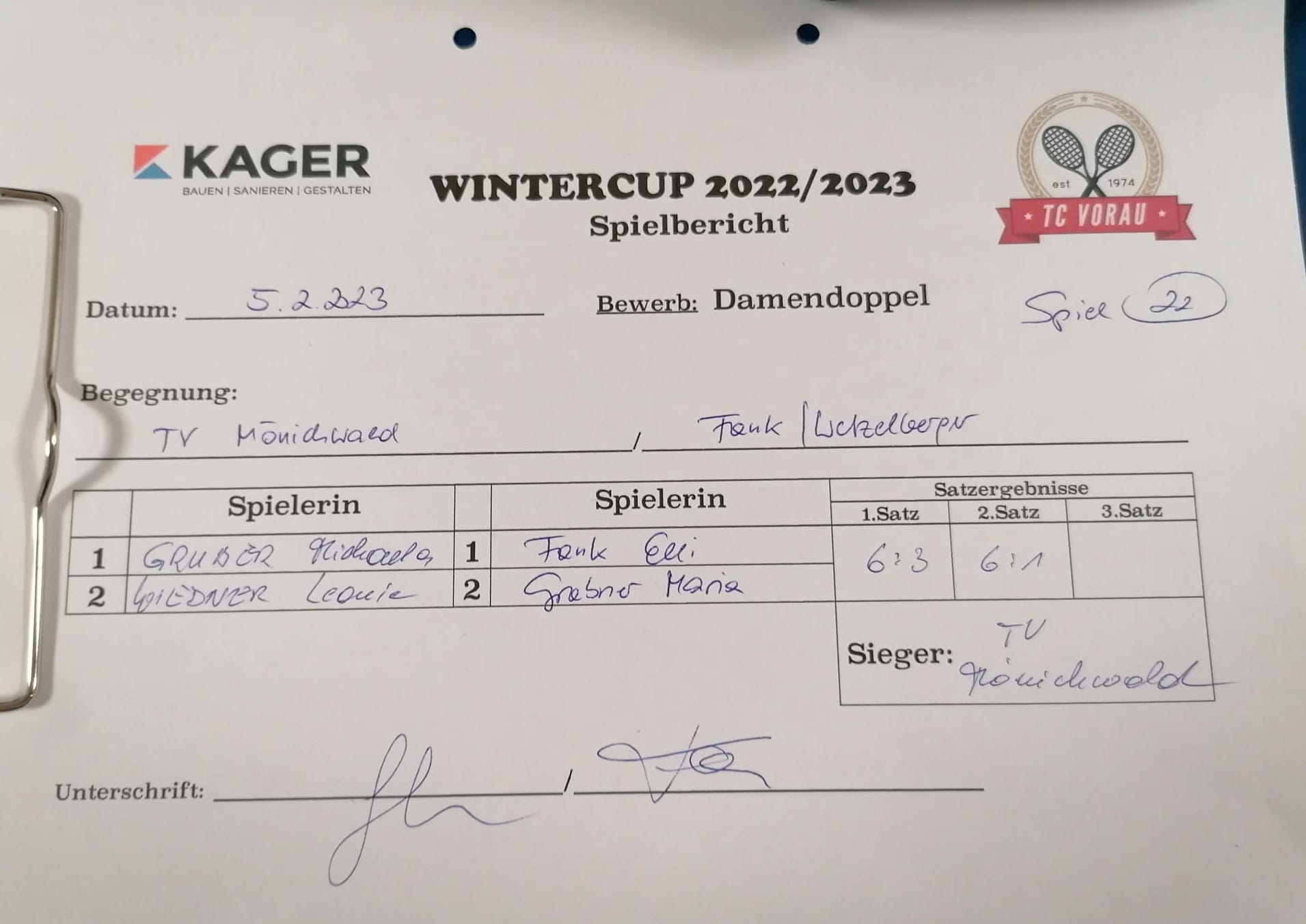 | 28.01.2023, 17:30 | Kaiser/Maierhofer | : | Faustmann/Pötz | 1:0 | - |