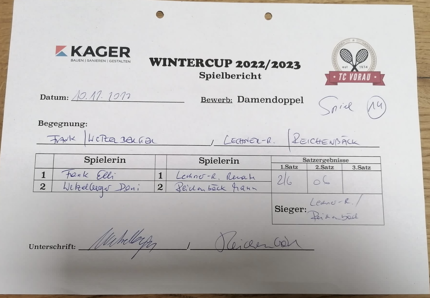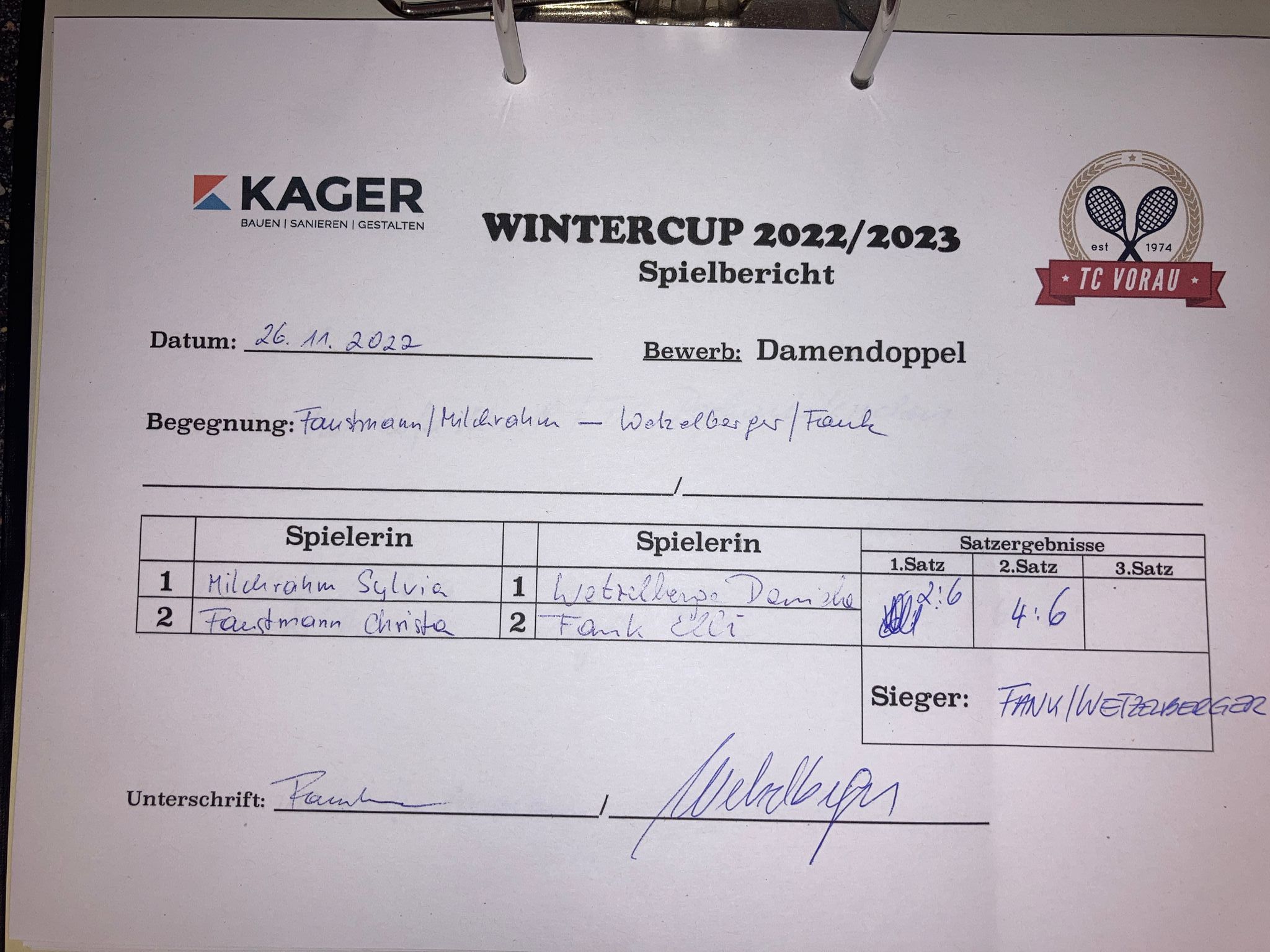 | 26.11.2022, 17:30 | Fank/Wetzelberger | : | Milchrahm/Faustmann | 6:2 6:4 | Herunterladen |