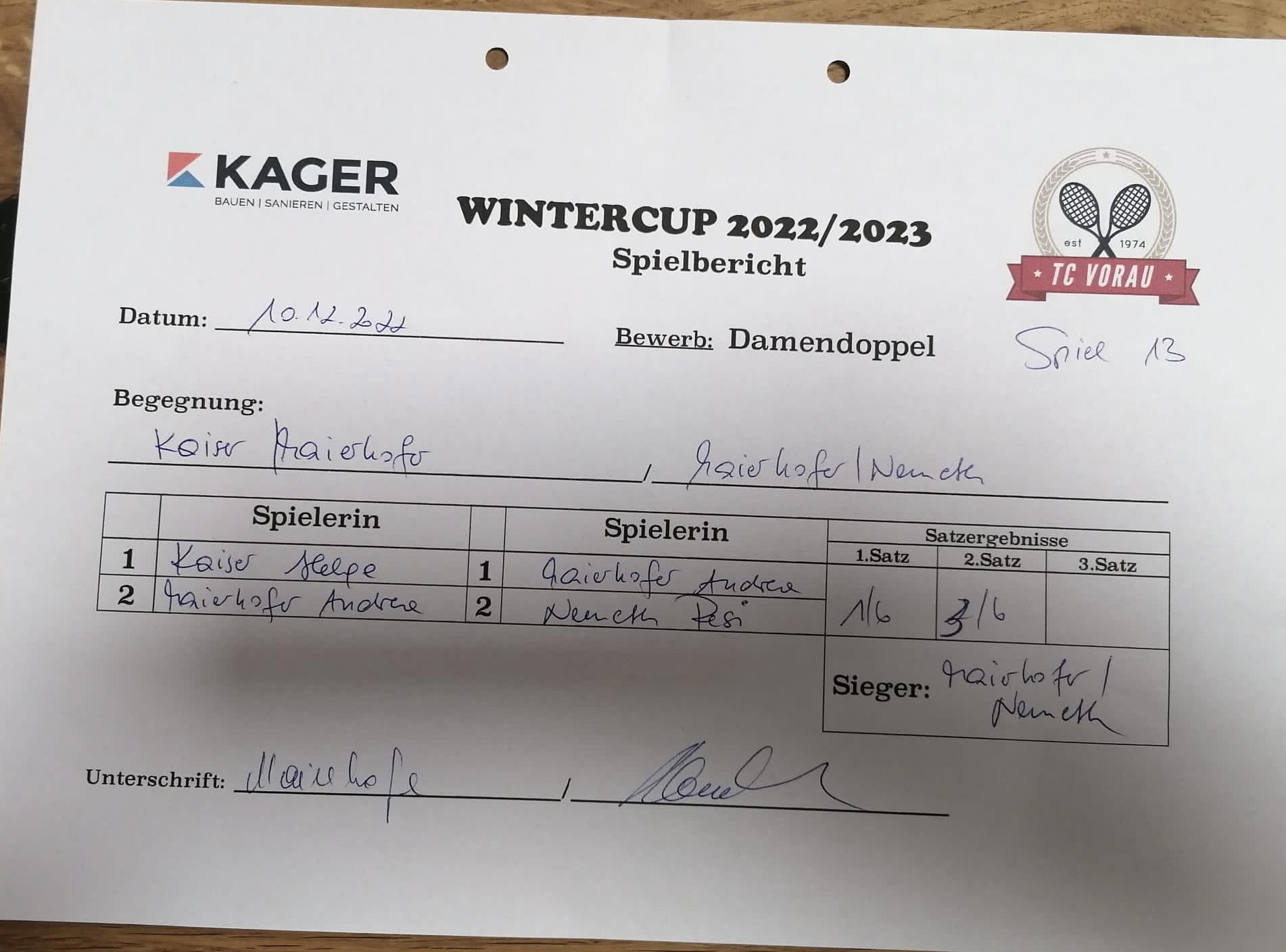 | 10.12.2022, 17:30 | Kaiser/Maierhofer | : | Maierhofer/Nemeth | 1:6 3:6 | Herunterladen |