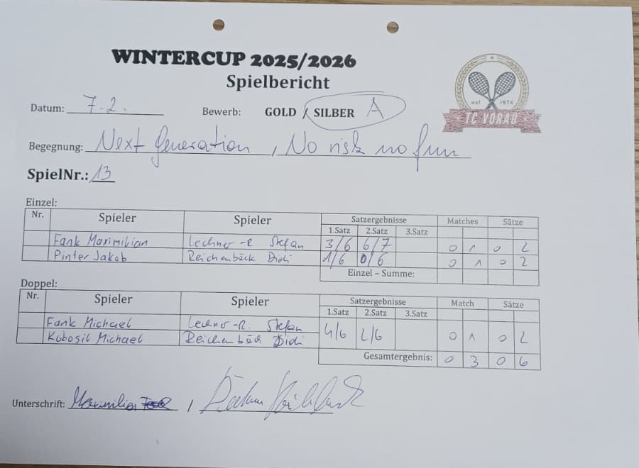 | 29.11.2025, 14:30 * | TC NEUSTIFT | : | NEXT GENERATION | 2:1 | Herunterladen |